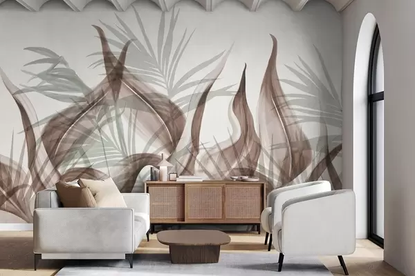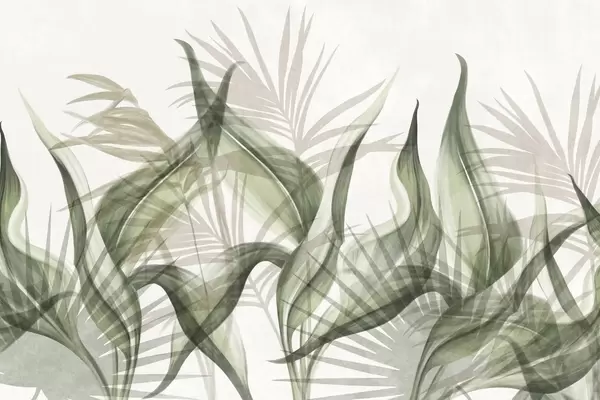 Fototapetai Tropiniai lapai rudų ir žalių atspalvių ant balto fono, tekstūruotas akvarelės stilius w09772