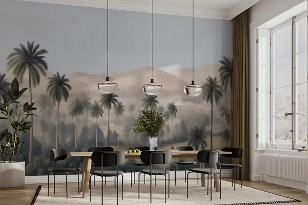 Fototapetai Tropinis peizažas su palmėmis ir kalnais, senovinis panoraminis vaizdas smėlio ir žalios spalvų tonais Nr. w09798