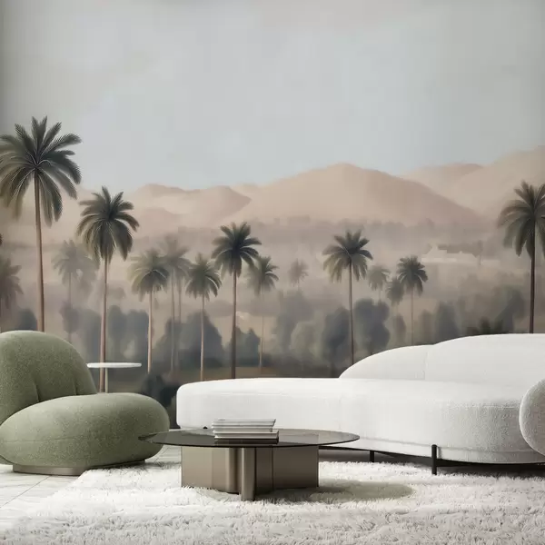 Fototapetai Tropinis peizažas su palmėmis ir kalnais, senovinis panoraminis vaizdas smėlio ir žalios spalvų tonais Nr. w09798