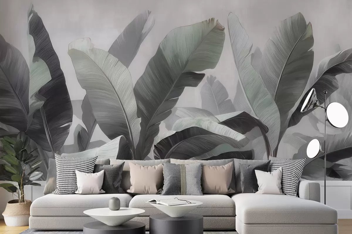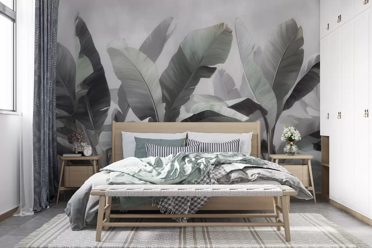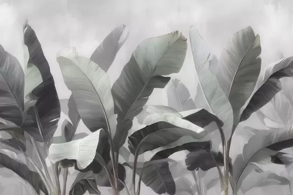 Fototapetai Abstrakčios didelių bananų lapų kompozicijos neutralios spalvų paletės fone su švelniais pilkai žaliais atspalviais Nr. w09805