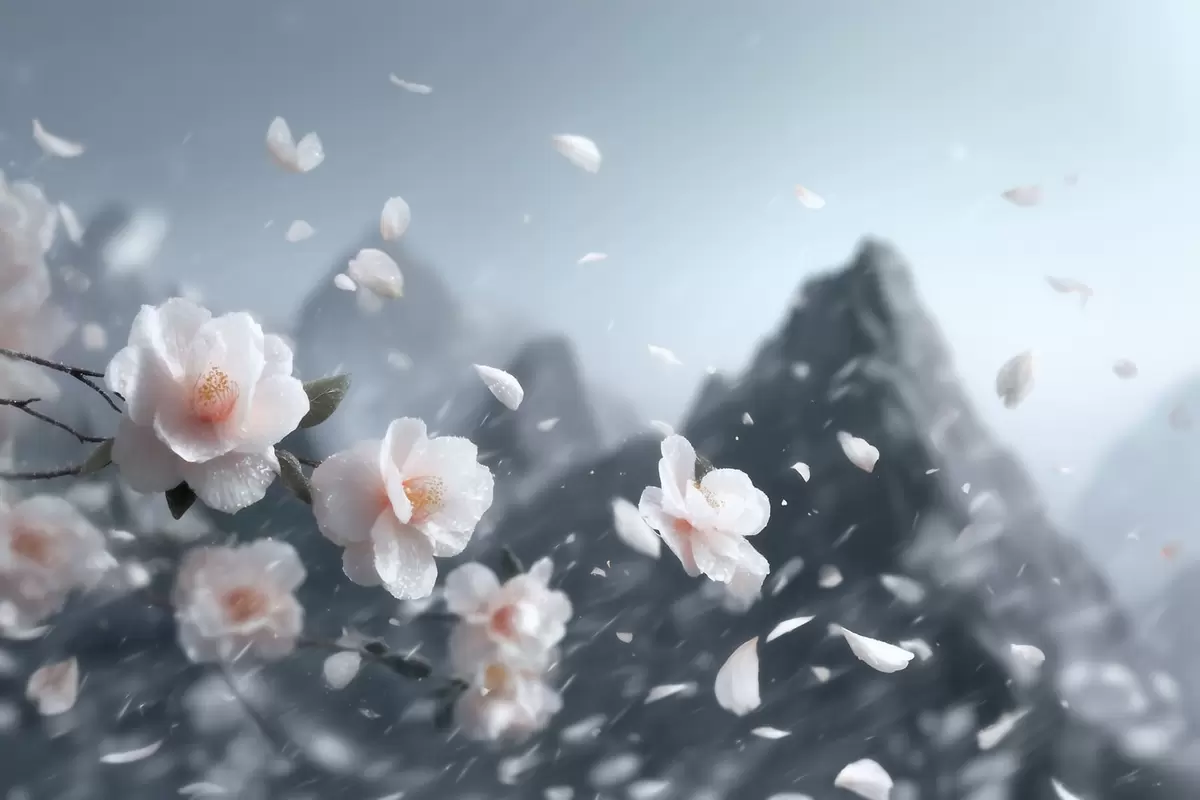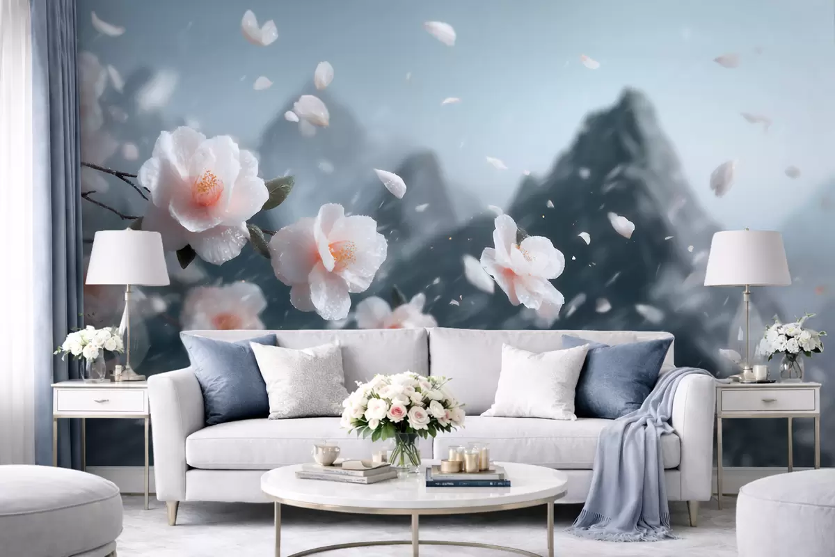 Fototapetai Subtilūs sakurų žiedai kalnų fone, nuotaikingas japonų peizažas pastelinėmis spalvomis Nr. w09808