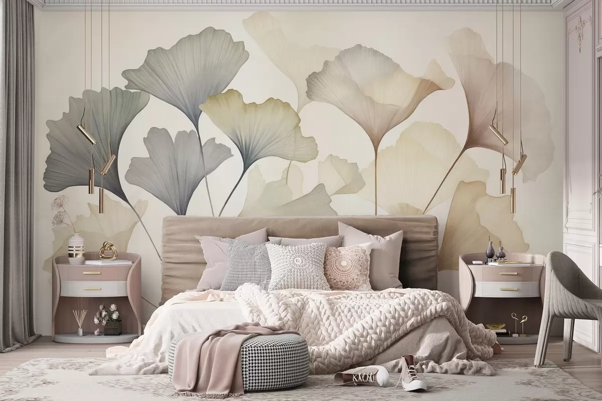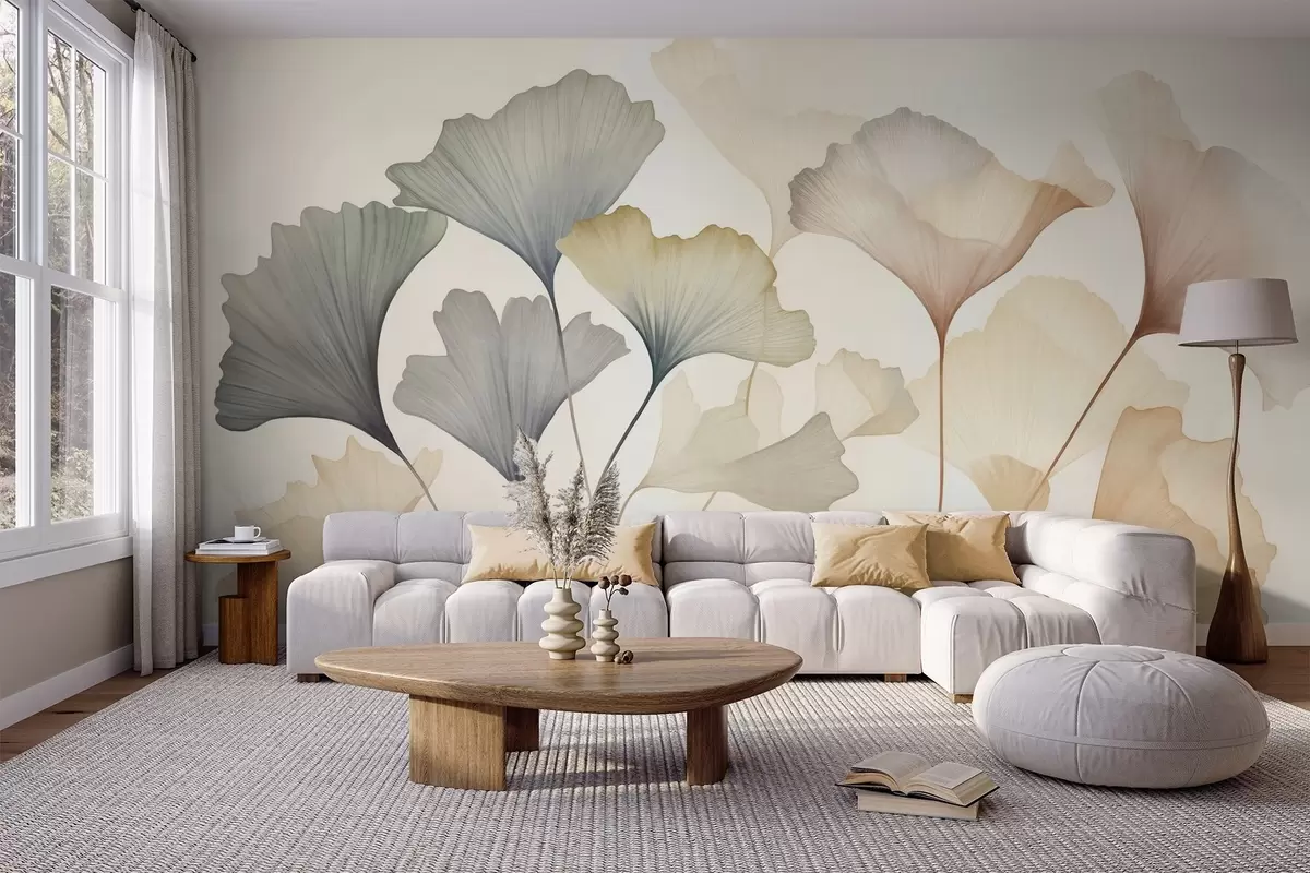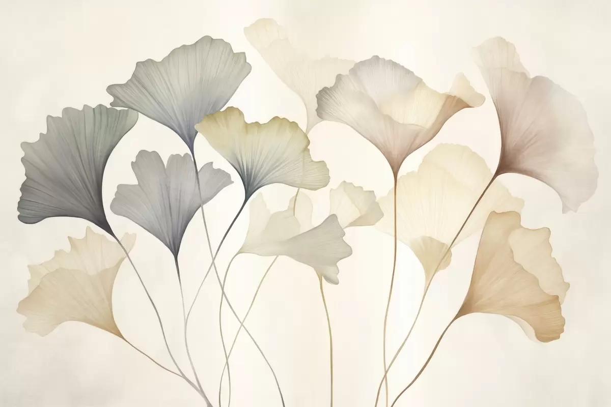 Fototapetai Ginkgo lapų abstrakcija, atlikta švelniomis pastelinėmis spalvomis – mėlyna, žalia ir persikų – su tekstūruotu paviršiumi Nr. w09810