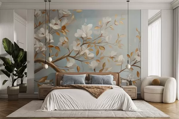 Fototapetai Tekstūruota medžio šaka su baltomis gėlėmis ir geltonais lapais, senovinio stiliaus Nr. w09814