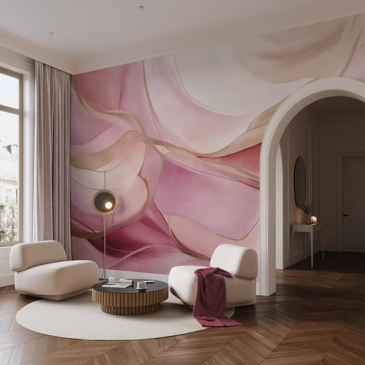 Fototapetai Abstrakčios tekstūruotos, banguojančios formos rožinės ir smėlio spalvų atspalviais su subtiliais geltonais linijomis Nr. w09818