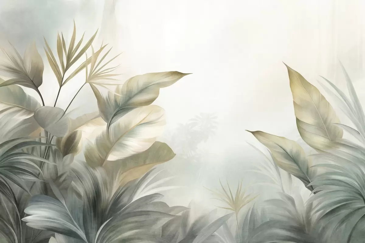 Fototapetai Dideliai, reljefiniai atogrąžų augalų lapai, nudažyti švelniais žaliais ir smėlio atspalviais, džiunglių aplinka Nr. w09820