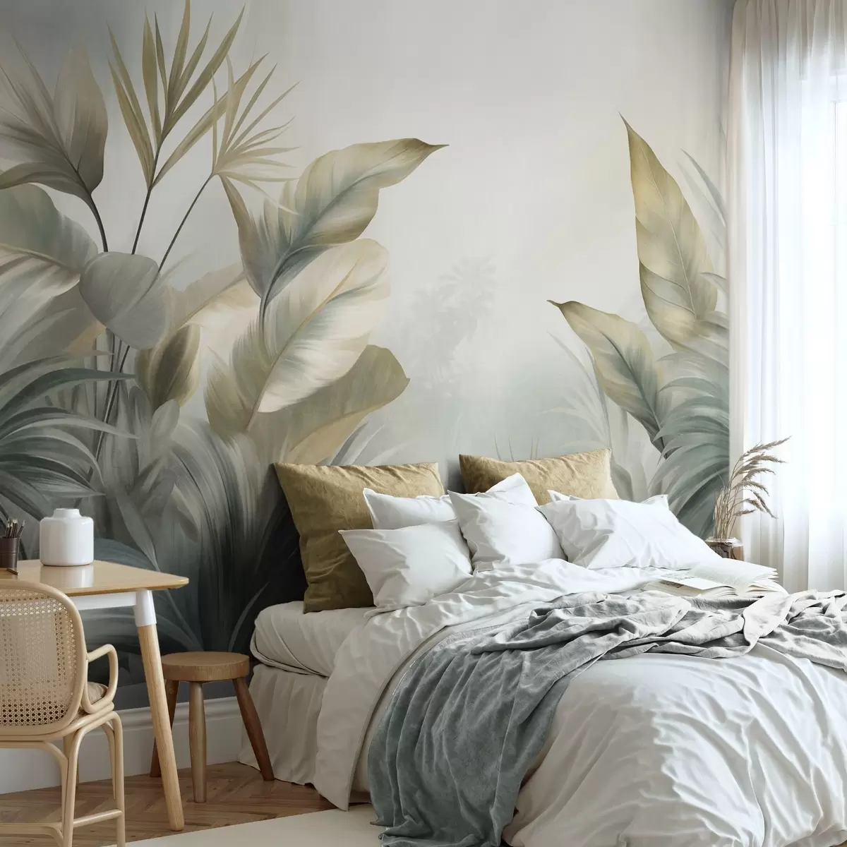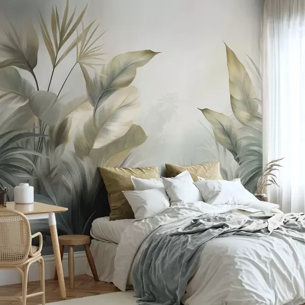 Fototapetai Dideliai, reljefiniai atogrąžų augalų lapai, nudažyti švelniais žaliais ir smėlio atspalviais, džiunglių aplinka Nr. w09820
