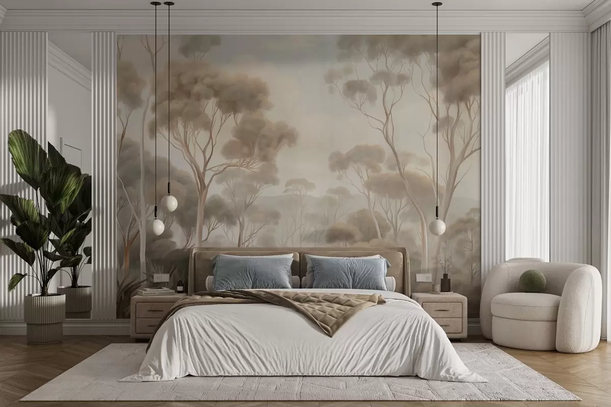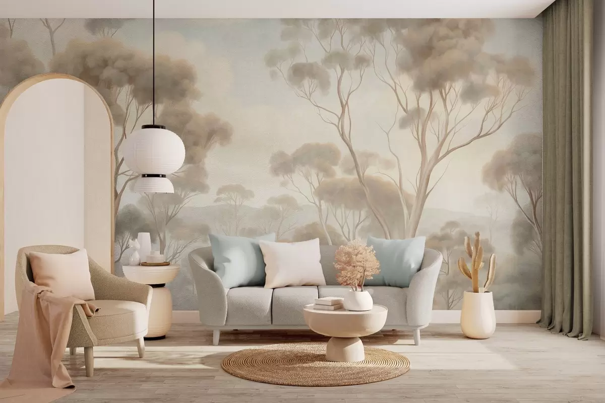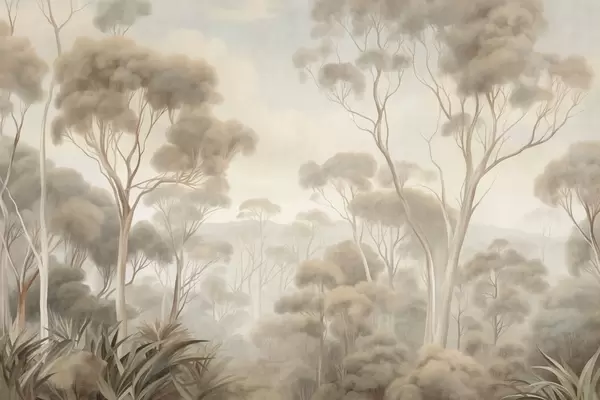 Fototapetai Rūko apgaubtas miško peizažas su aukštais eukaliptų medžiais, banguotos kalvos po debesuotu dangumi, tekstūrinis meno kūrinys Nr. w09822