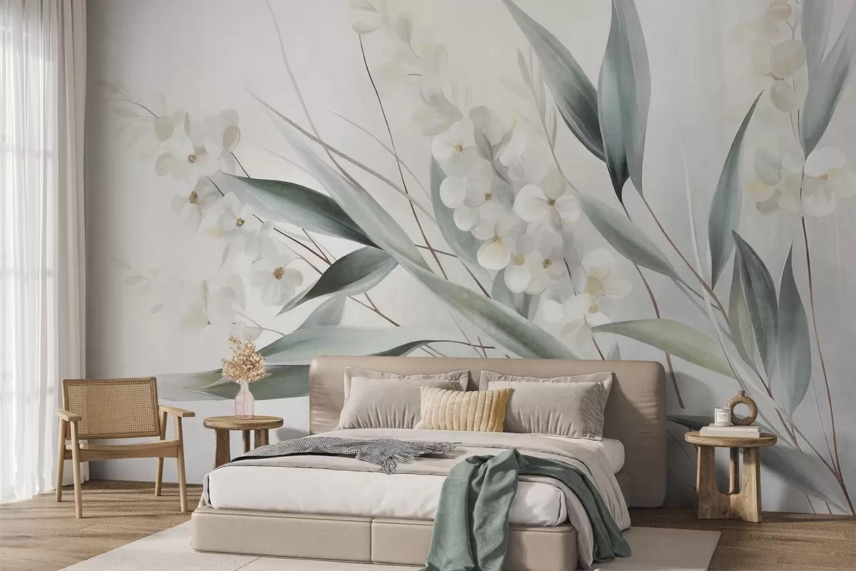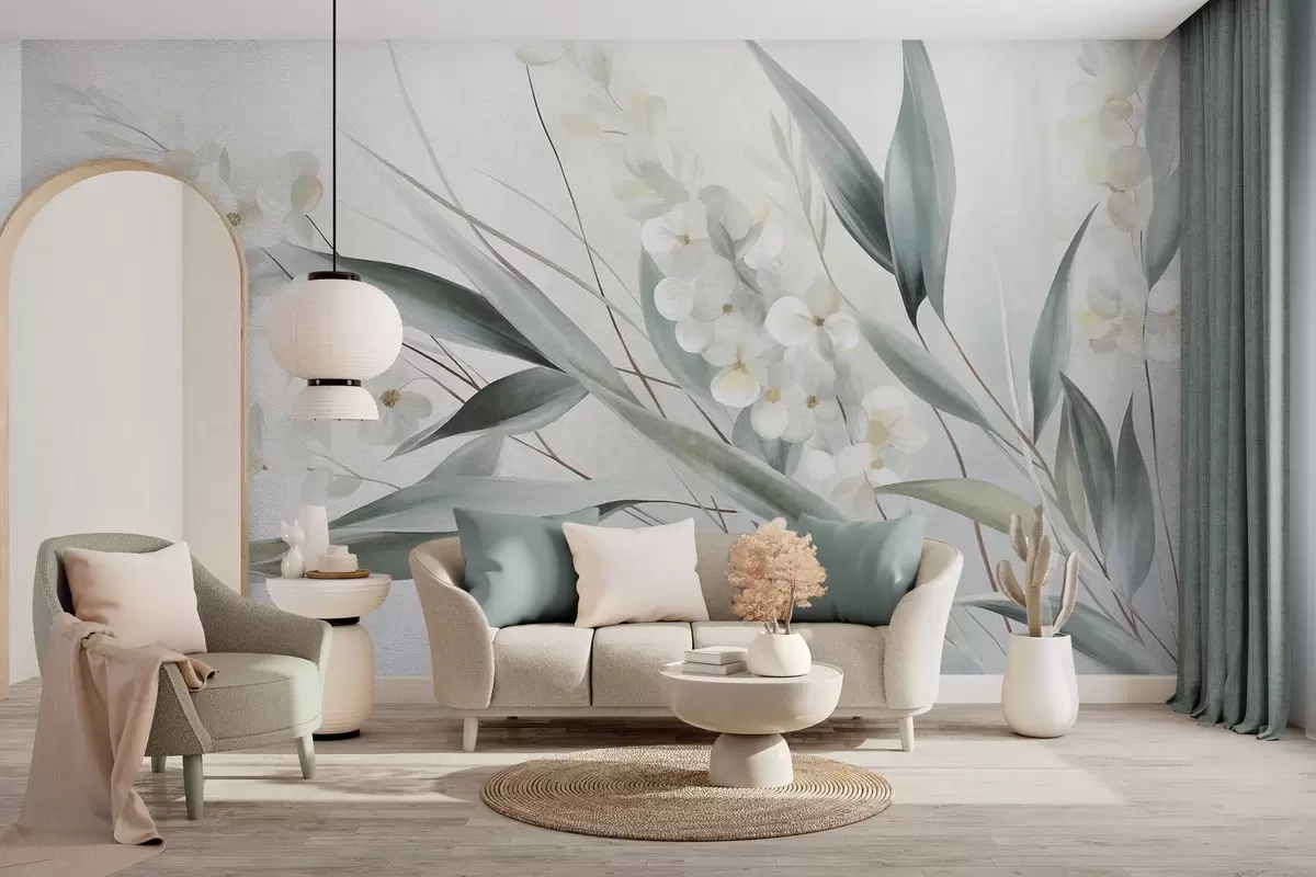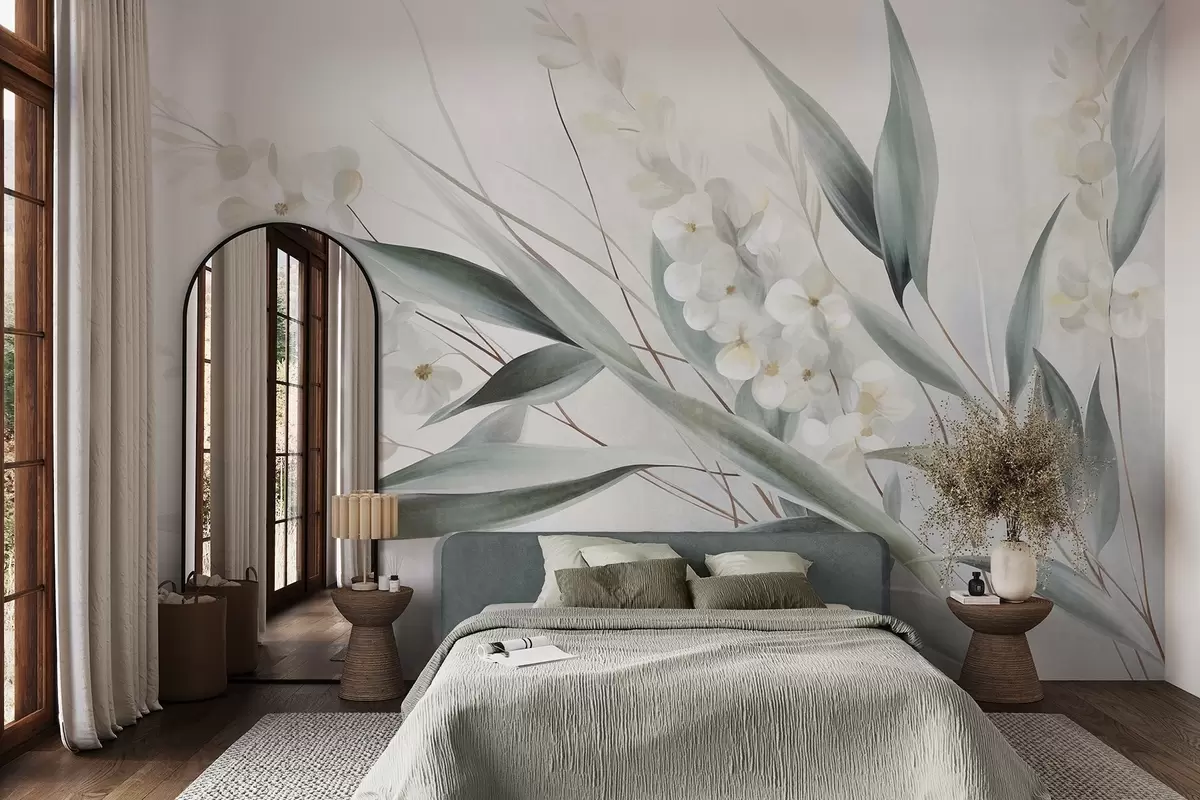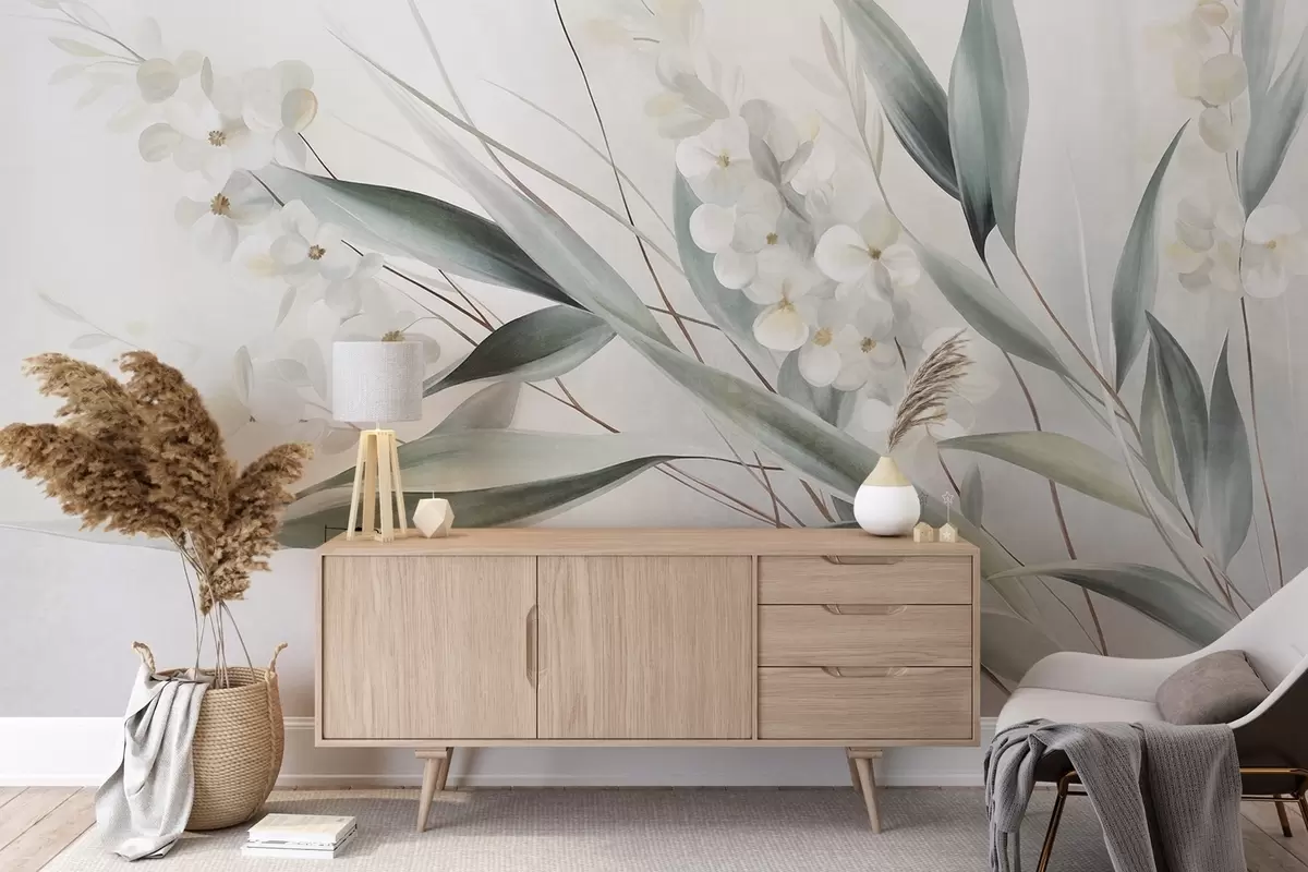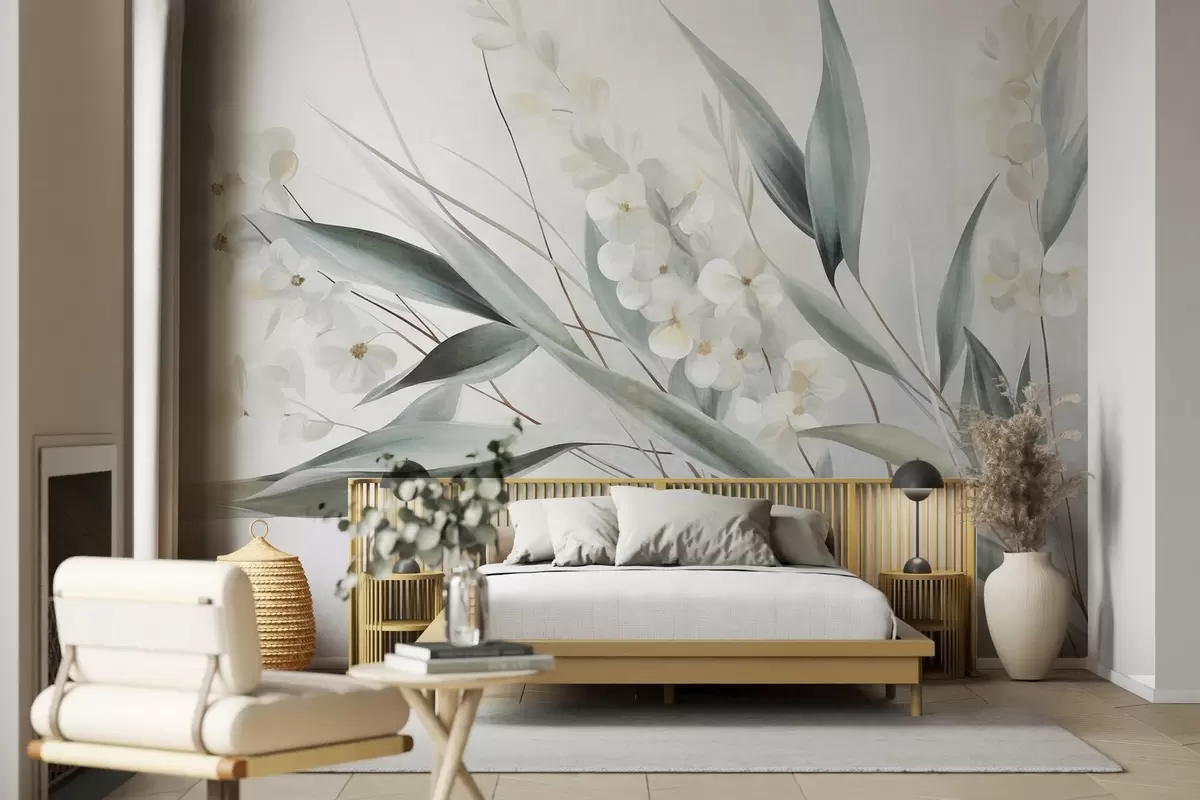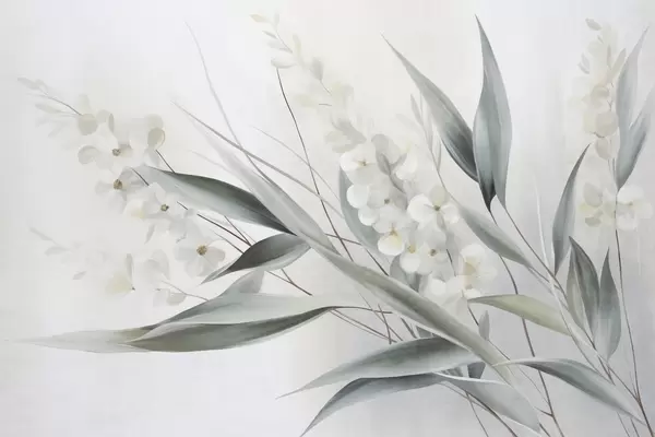 Fototapetai Subtilūs žiedai ir ilgi žali lapai, pavaizduoti tapybiniu stiliumi su subtiliais potėpiais, tekstūrinis menas Nr. w09827