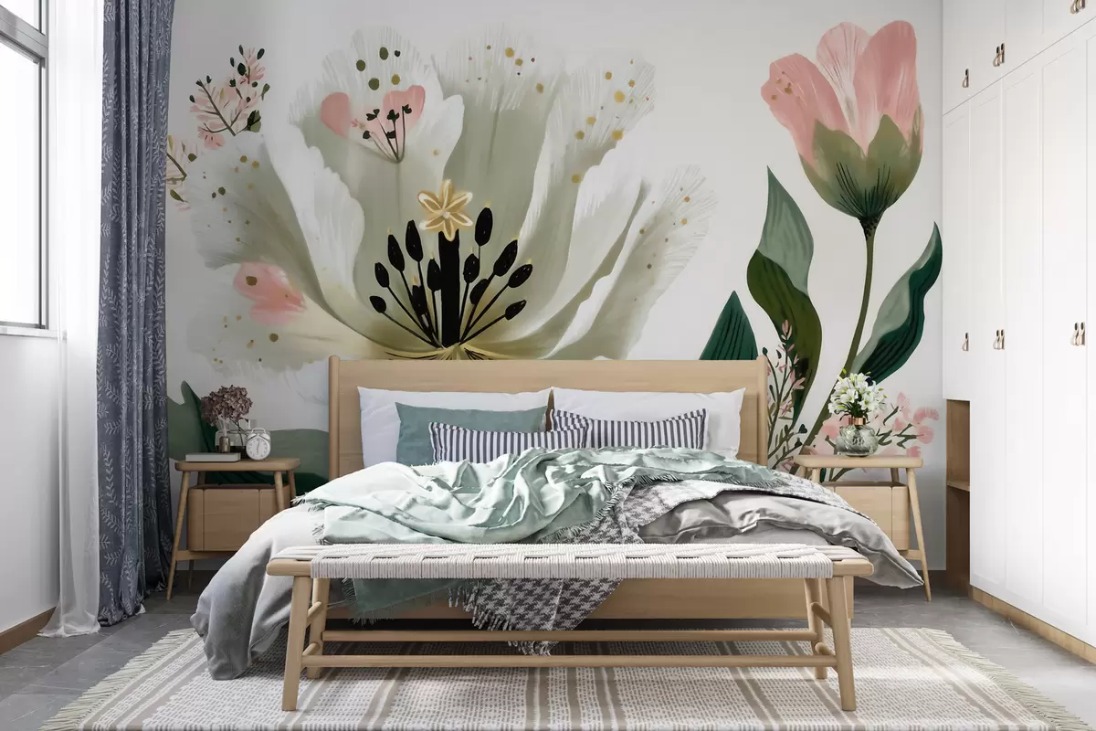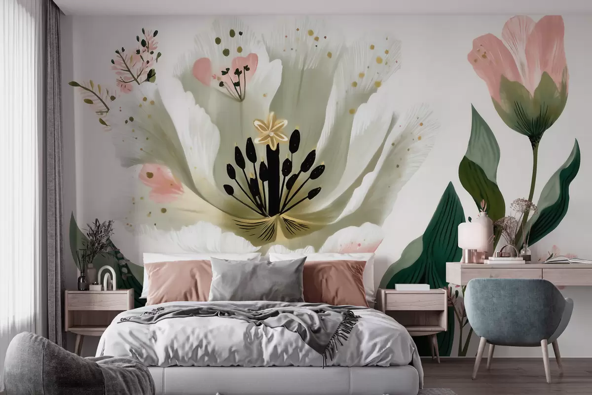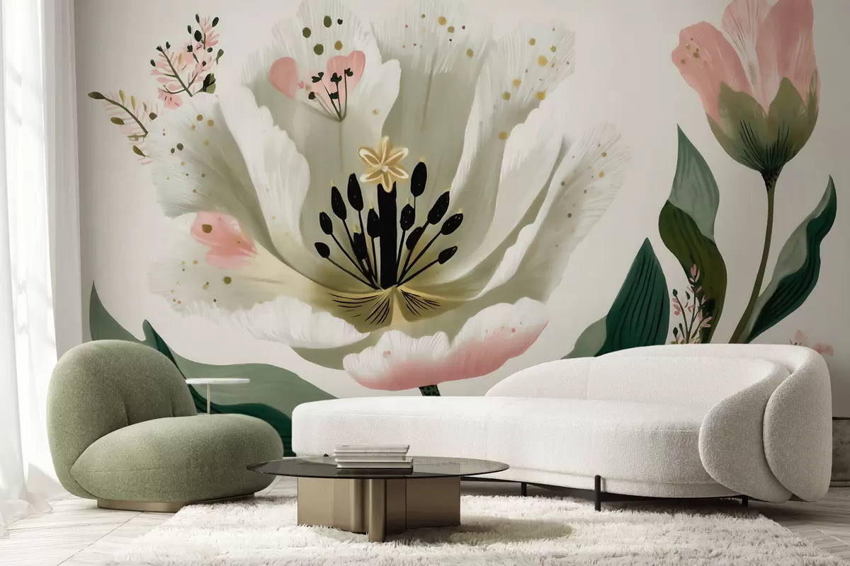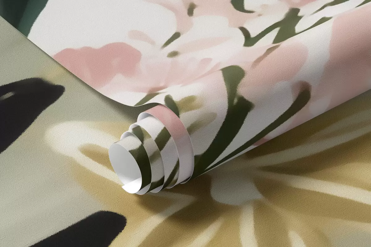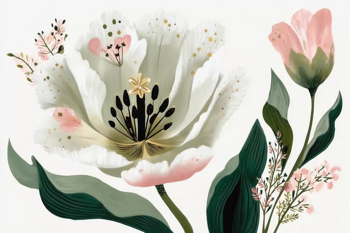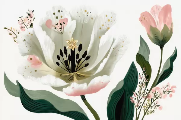 Fototapetai Gėlė su žaliais lapais ir švelniai rožiniais akcentais, nutapyta akvarelės stiliumi Nr. w09836