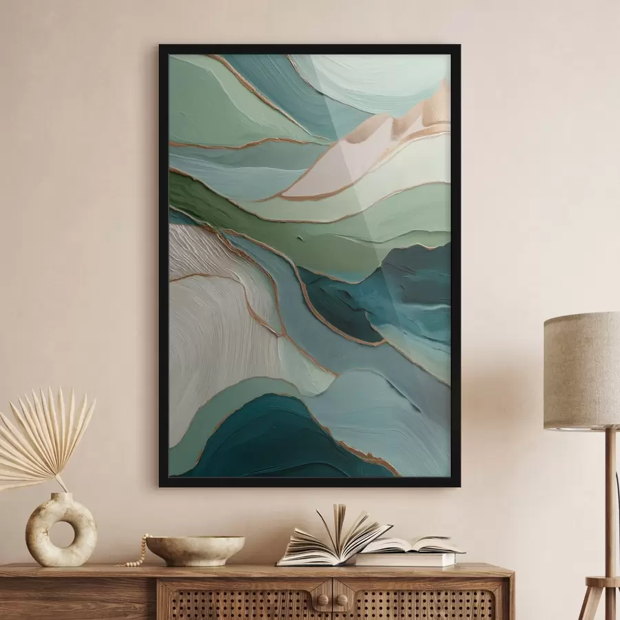 Smaragdo-kreminė abstrakcija su geltonomis upeliais