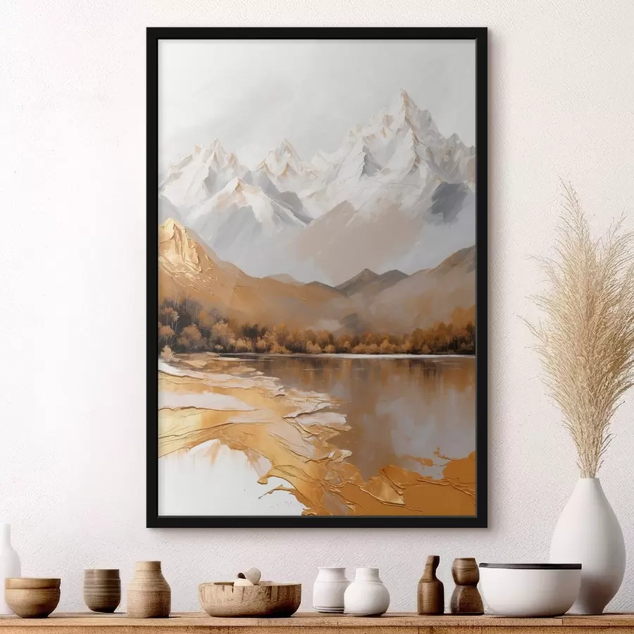 Peizažo tekstūruotas paveikslas, imituojantis kalnus ir ežerą