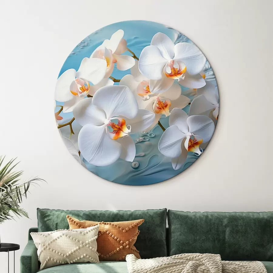 Baltos orchidėjos, išdėstytos ant šviesiai mėlyno paviršiaus su vandens lašeliais, švelnus apšvietimas