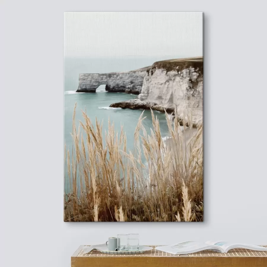 Jūra ir uolų arka, vaizdas per sausą žolę
