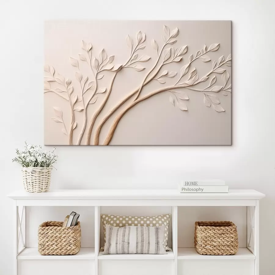 Reljefiniai apskritimai ir šaka šiltų neutralių atspalvių