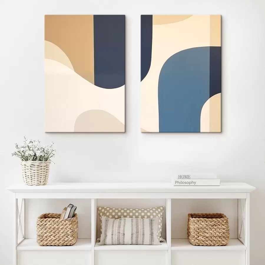 Abstrakti kompozicija su tekančiomis linijomis ir permatomais žiedlapiais mėlynos, baltos ir smėlio spalvos atspalviais, alkoholinio tušo imitacija