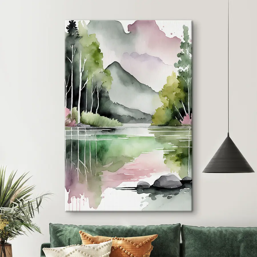 Gamtos peizažas su upe, mišku ir pušimis, švelnios pastelinės spalvos