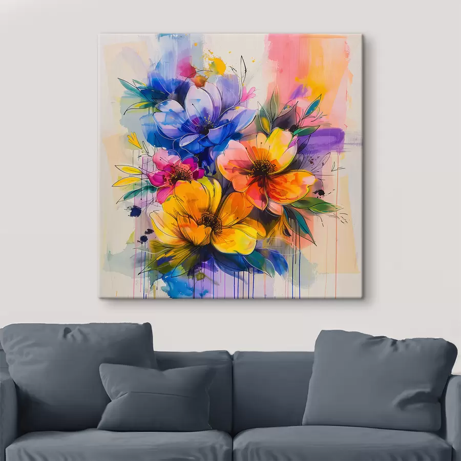 Violetinė akvarelės iliustracija, puokštė, gėlės, mėlyna, violetinė, žalia spalva
