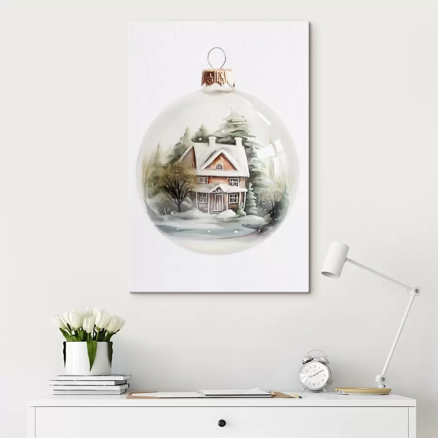 Krištolinis rutulys su akvareliniu namu ir medžiais sniege