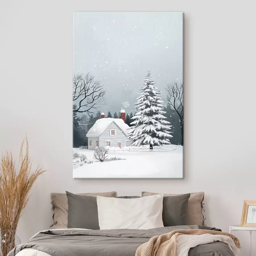 Žiemos scena su sniegu padengtu namu, mišku, pušimis