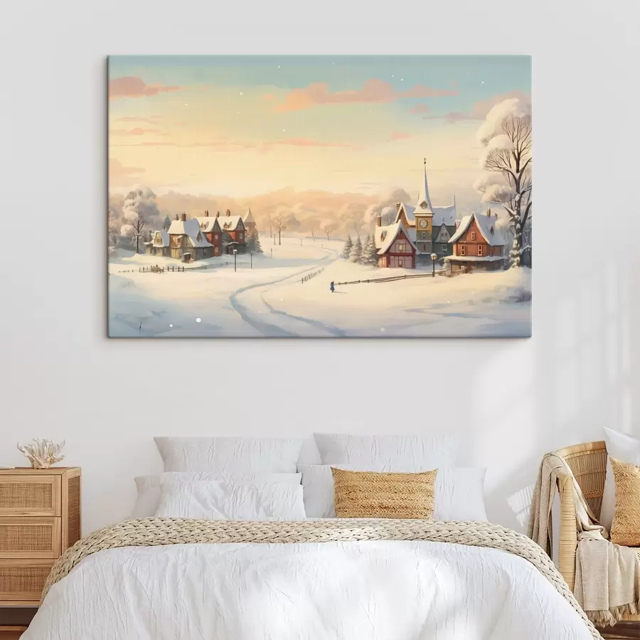 Žiemos stebuklų šalis, namai, saulėlydžio dangus, medžiai, akvarelė