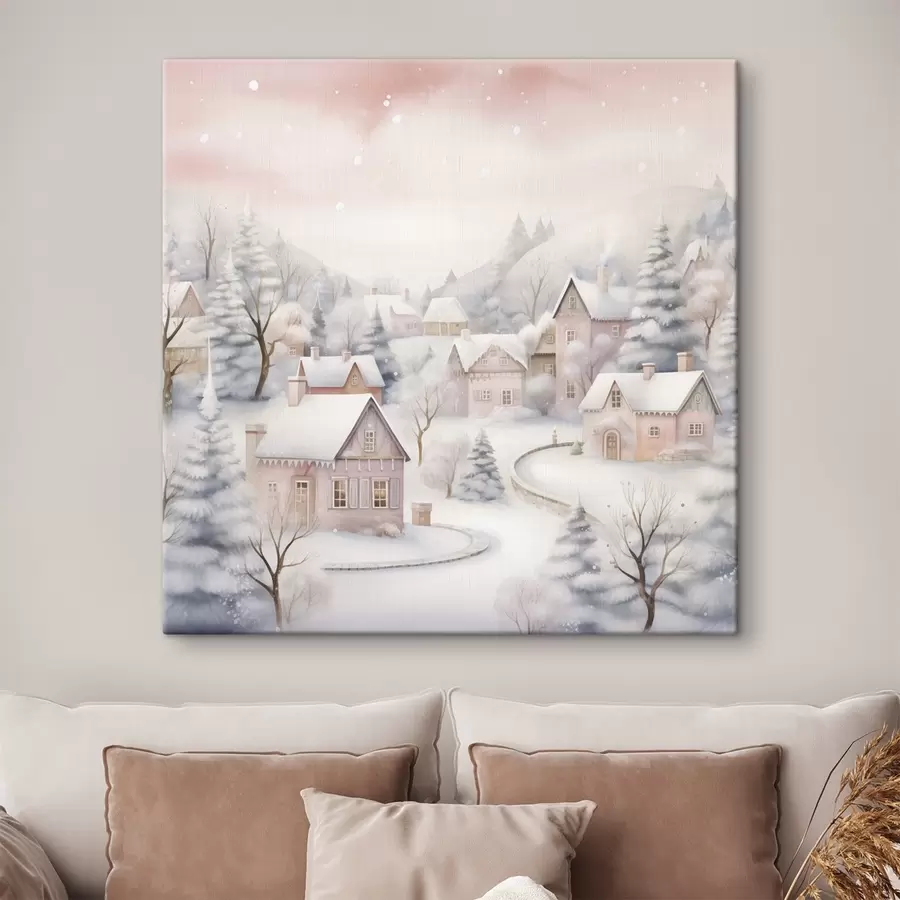 Žiemos miestas su rožiniais namais, kalėdinėmis eglutėmis, snaigėmis