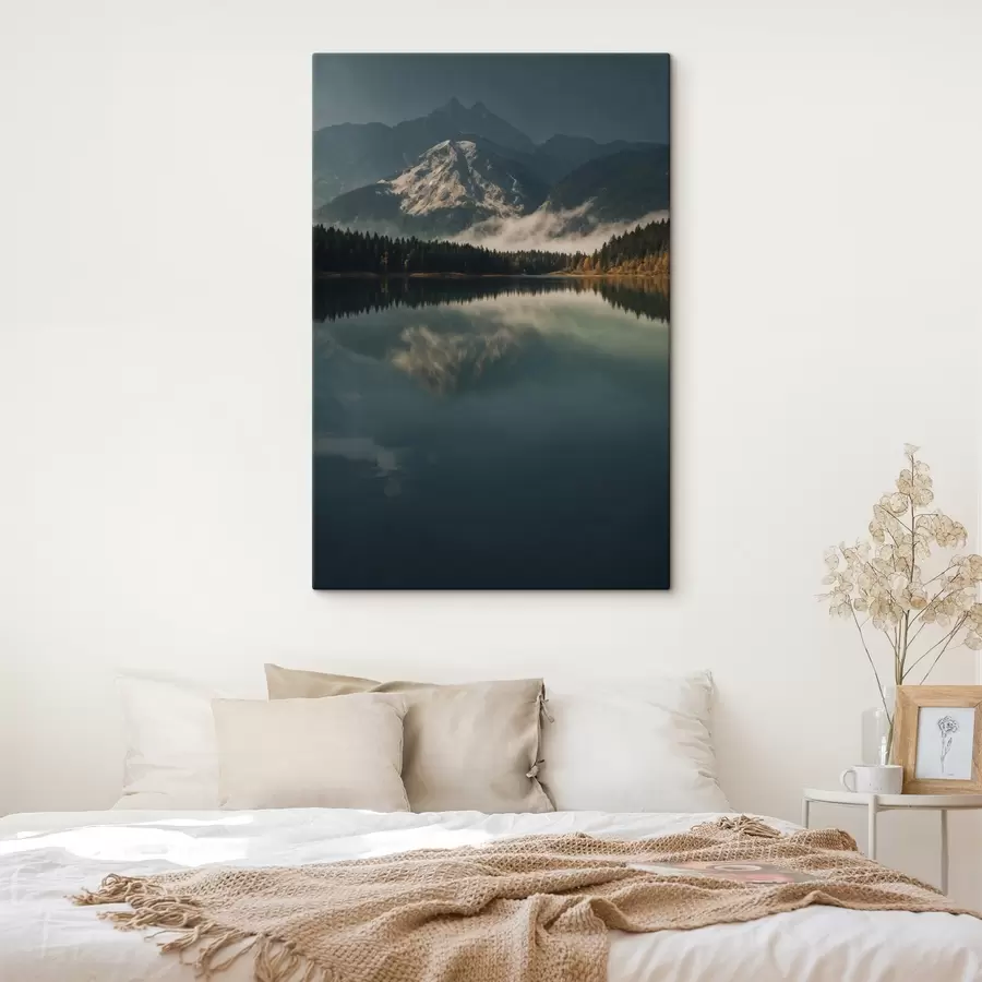 Ramus Alpių ežeras, apsuptas didingų snieguotų kalnų, su tankiu mišku ir debesuotu dangumi