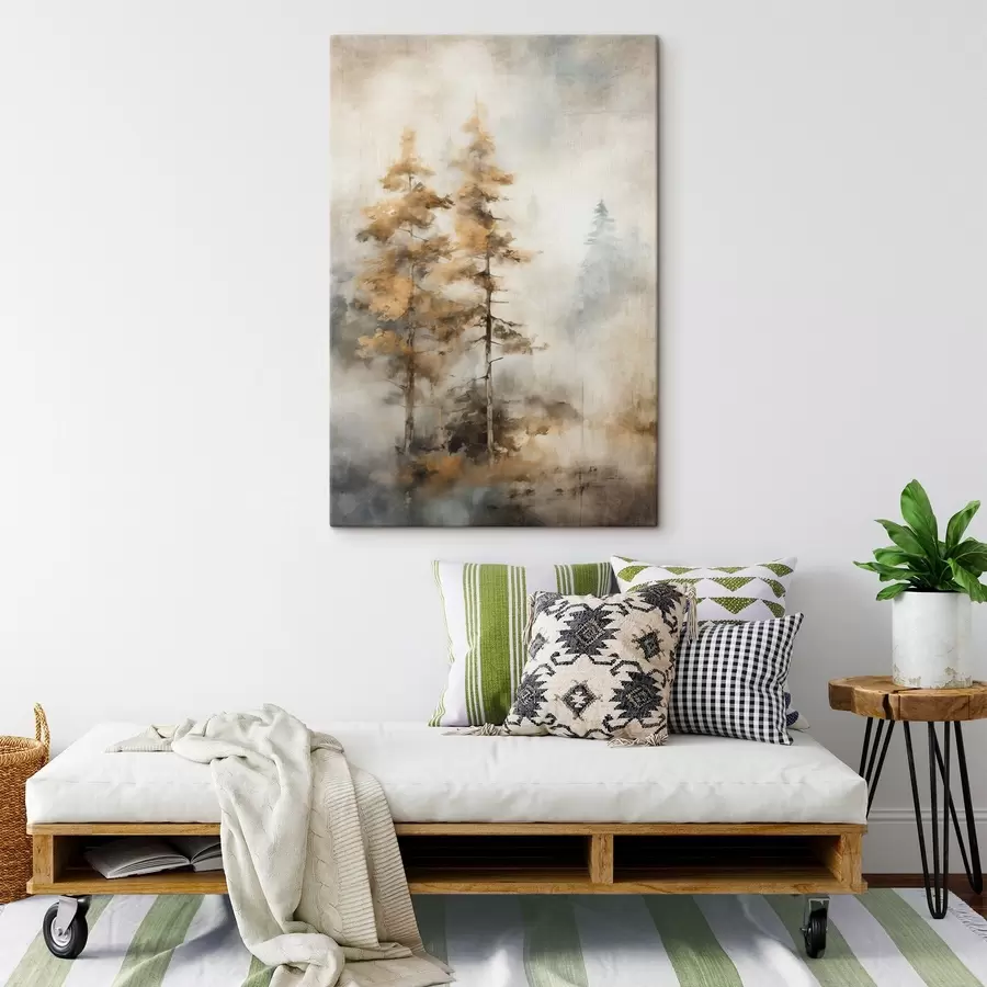 Tekstūruoti aukšti medžiai su geltonais lapais miške , fone susipina švelnūs mėlyni ir rudi tonai