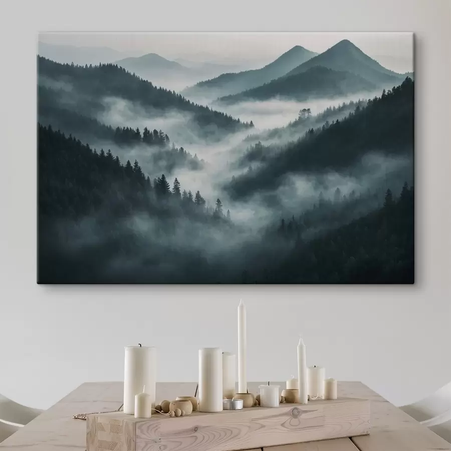 Gražūs rūke paskendę kalnai, rudens miškas, akvarelė