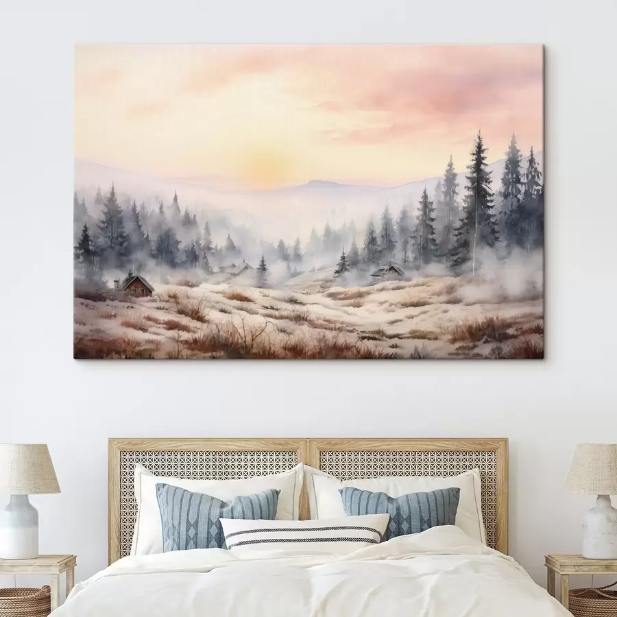 Gražūs kalnai, miglotas miško kraštovaizdis, akvarelė, kaimas