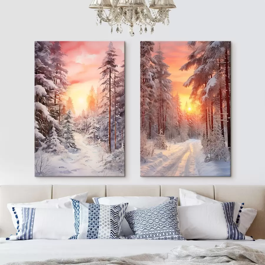 Akvarelė žiemos miškas, snieguoti medžiai, gražus dangus, saulėlydžio spalvos