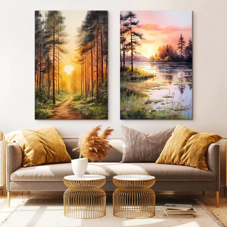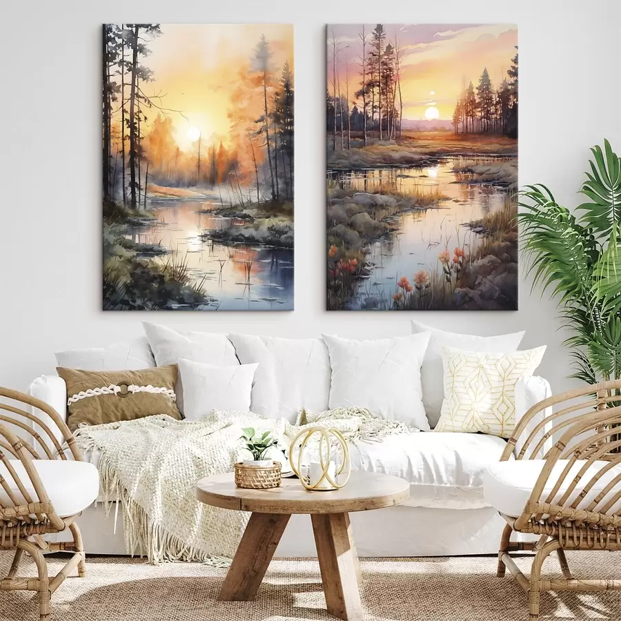 Miško akvarelė, rūkas ant ežero, saulėlydžio dangus, medžiai ir gėlės
