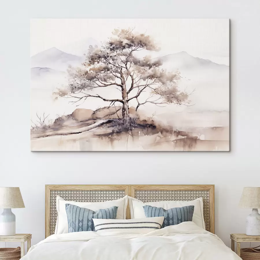 Vienišas medis su susisukusiu kamienu ir retomis šakomis švelniame, prislopintame kalnų fone