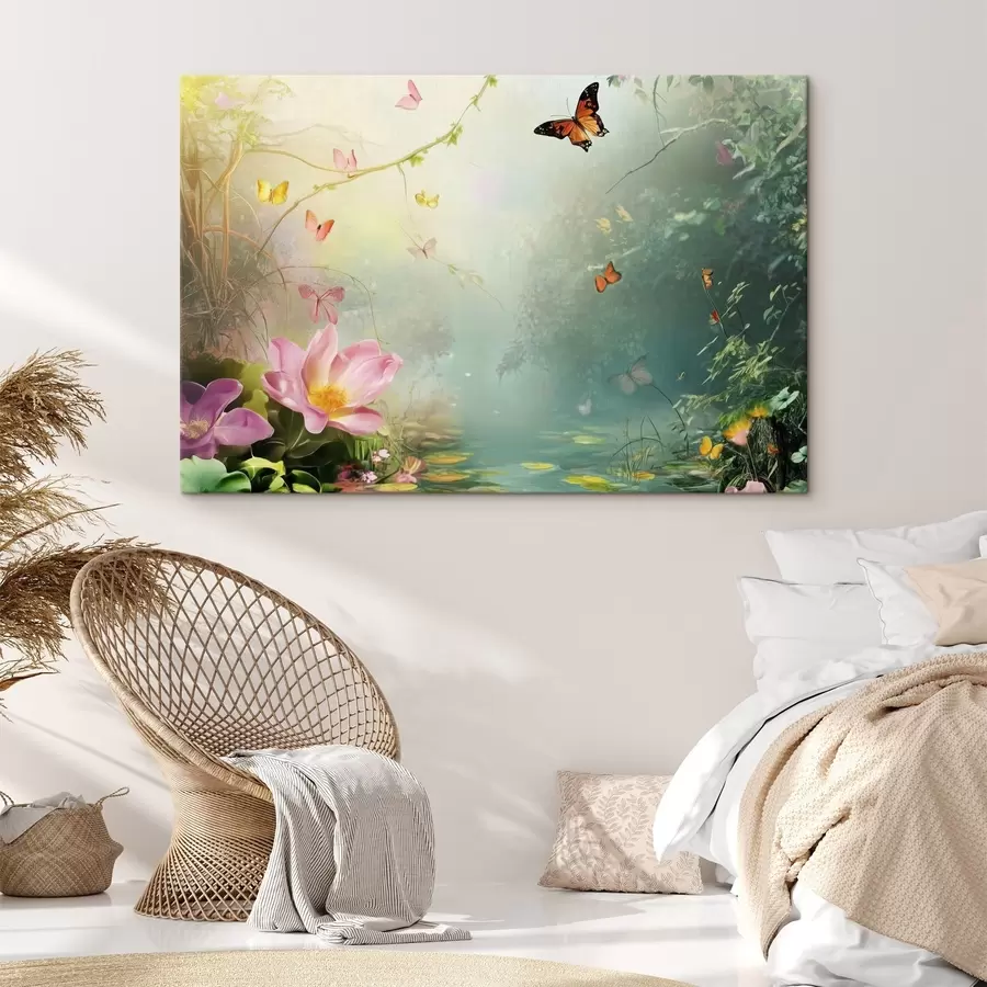 Gražus gamtos peizažas, tvenkinys ir medžiai, laukinė gamta, švelnios pastelinės spalvos