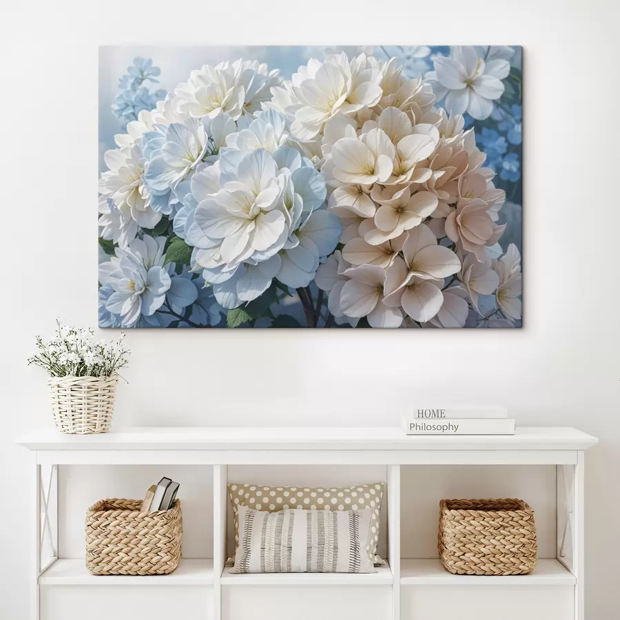 Šaka su baltomis orchidėjomis, imituojanti tapybą