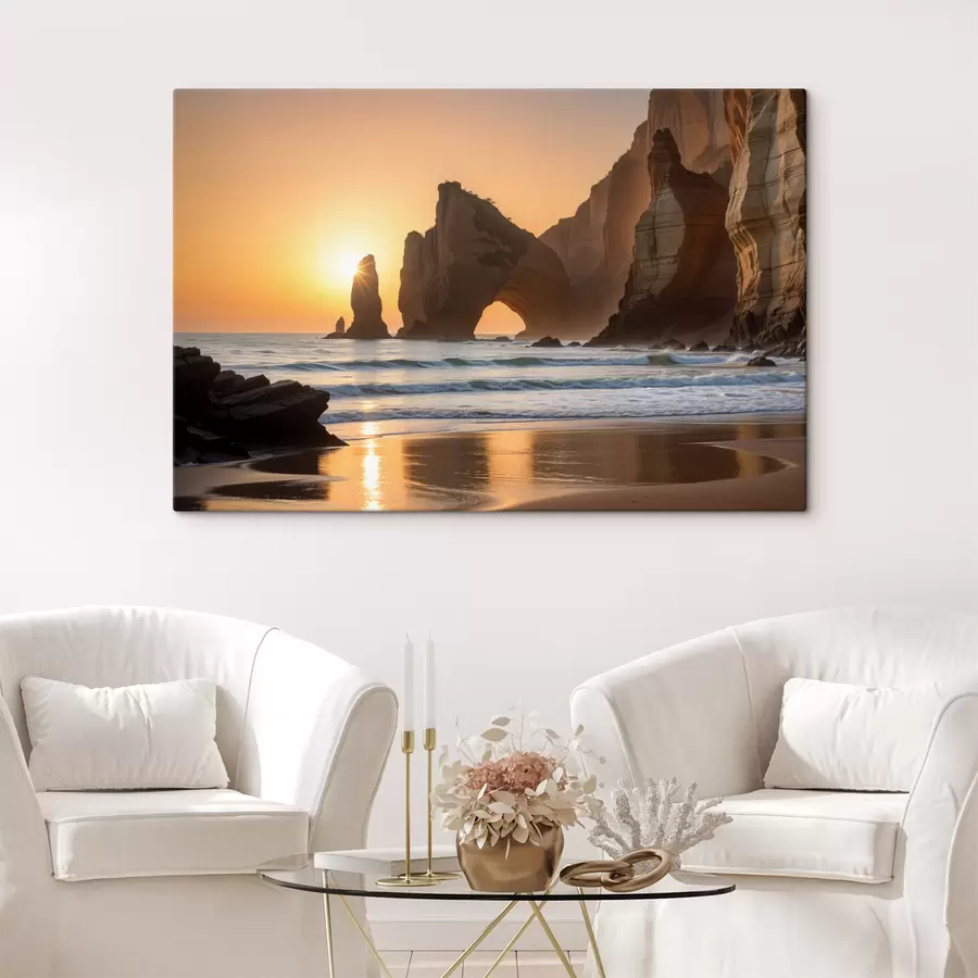 Uolėta pakrantė su jūros stulpais ir arkomis saulėlydžio metu, o bangos dūžta smėlio paplūdimyje
