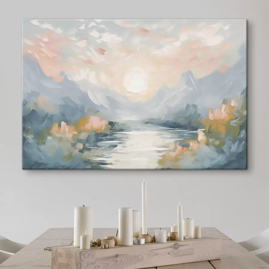 Rami upė su kalnais, saulėtekis, švelnios spalvos