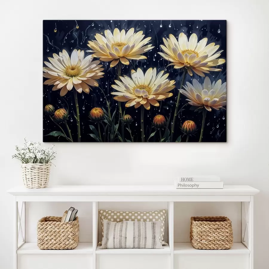Didelių geltonų margučių gėlių laukas su baltais žiedlapiais tamsiame nakties danguje su žvaigždėmis