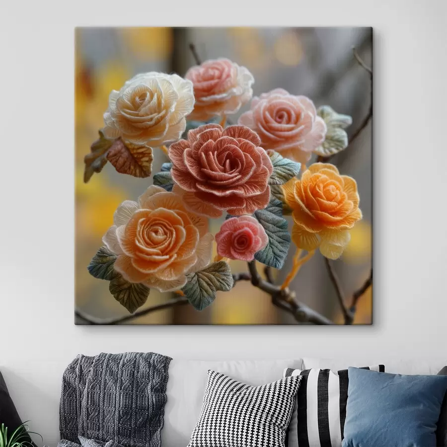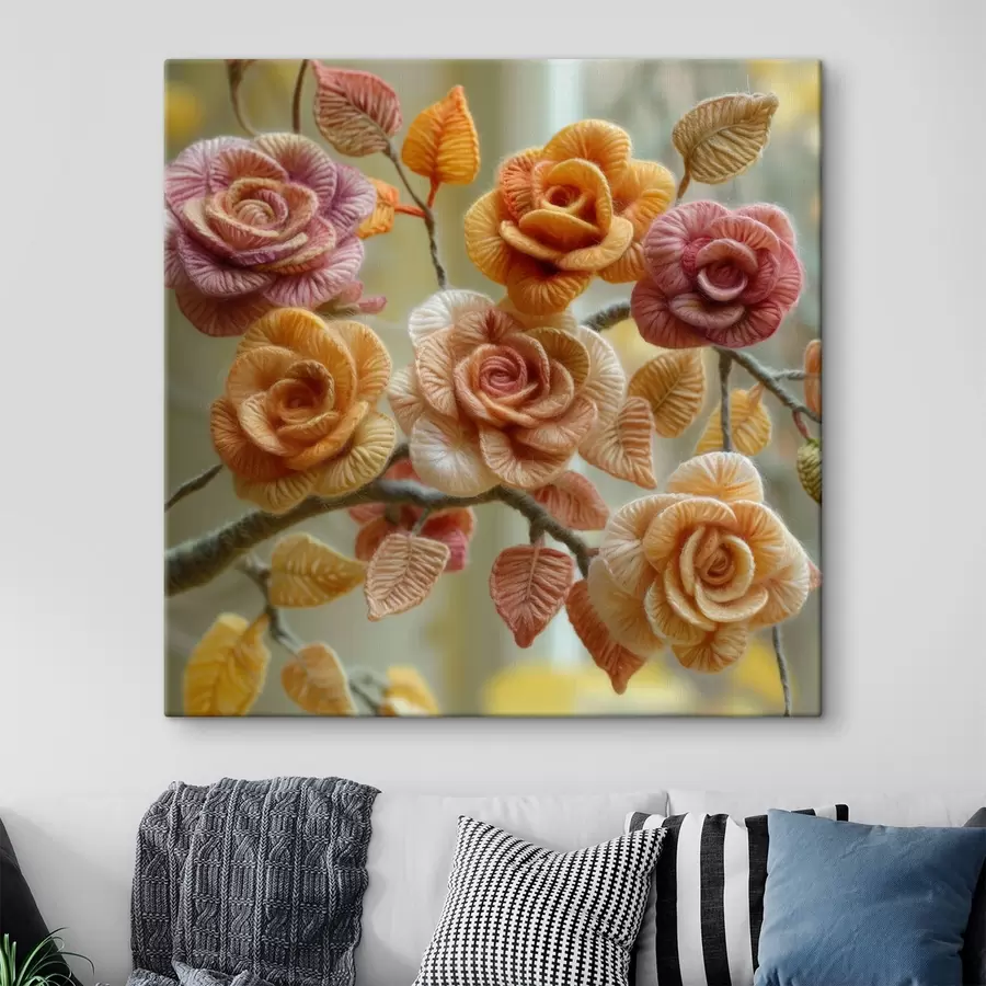 Rožės, išaustos iš minkštos purios vilnos ant medžio