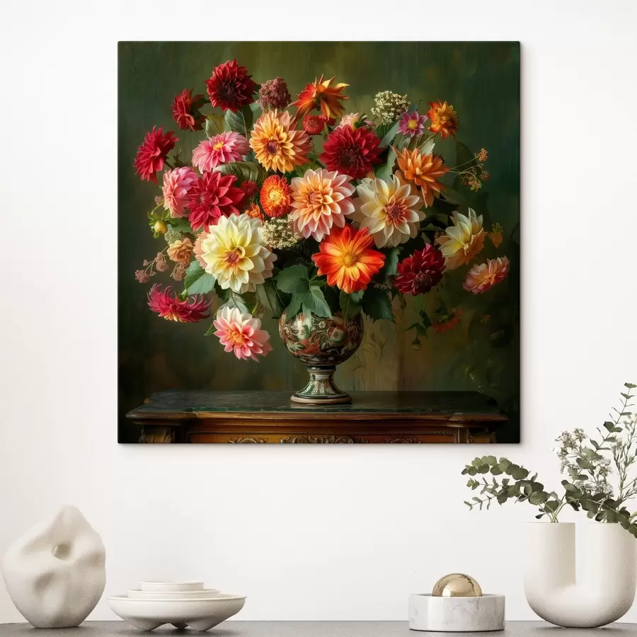 Sodri chrizantemų puokštė vazoje tamsiai žaliame fone