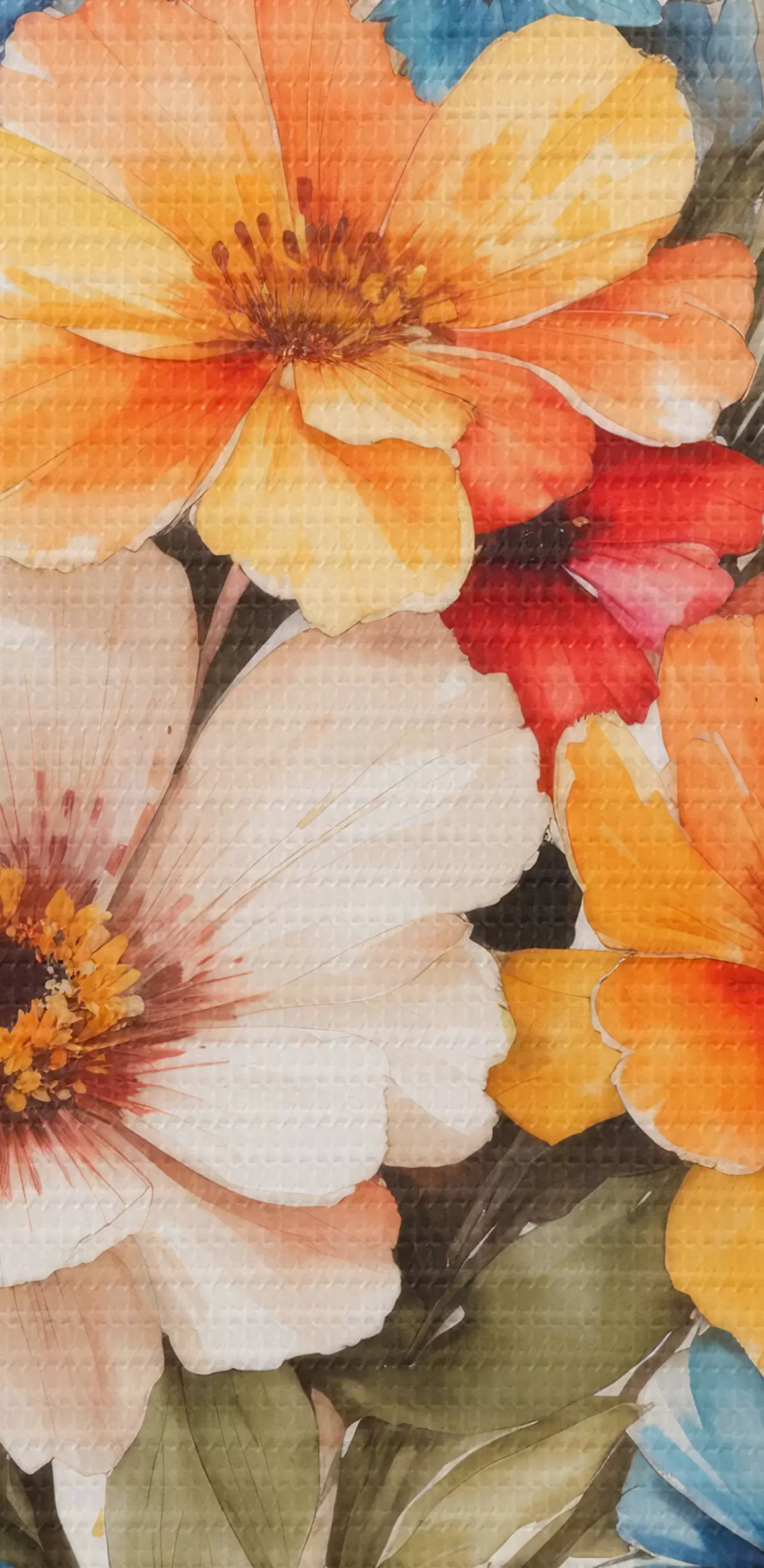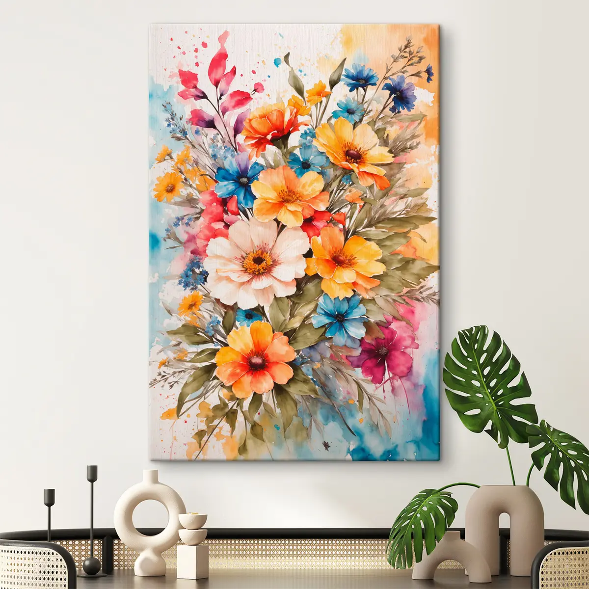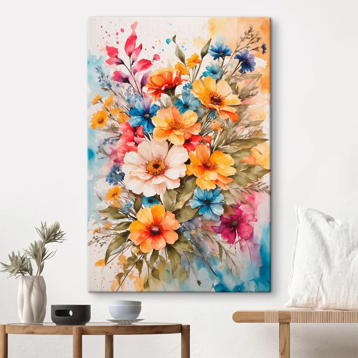 Paveikslas Akvarelinė rožinių, geltonų, mėlynų ir raudonų gėlių puokštė Nr s36121