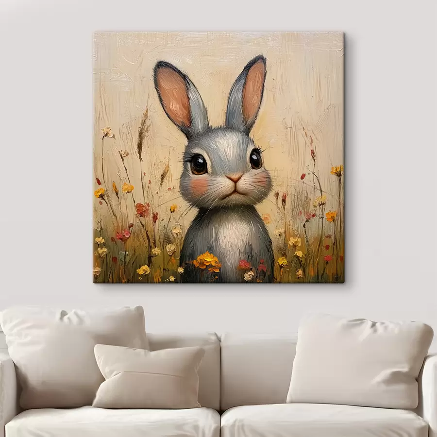 Zuikis lauke tarp gėlių su teptuko potėpiais