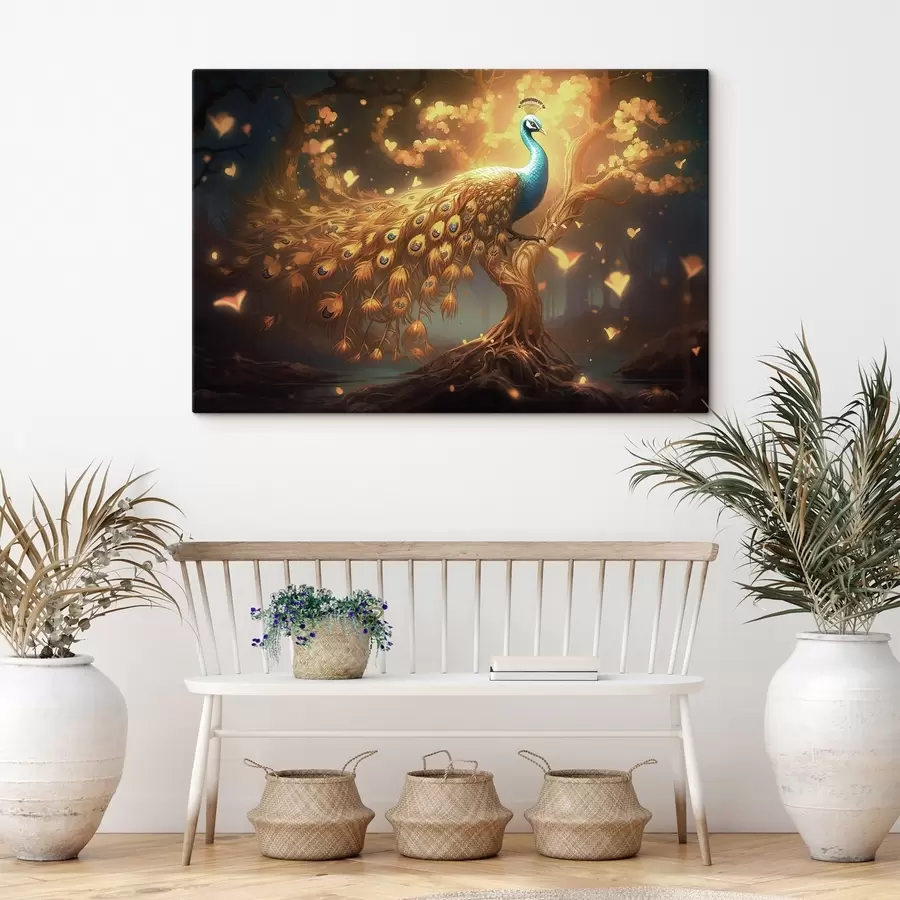 Ant šakos tamsiame fone su šviečiančiais medžiais ant šakos sėdintis povas su ryškiai plunksnomis