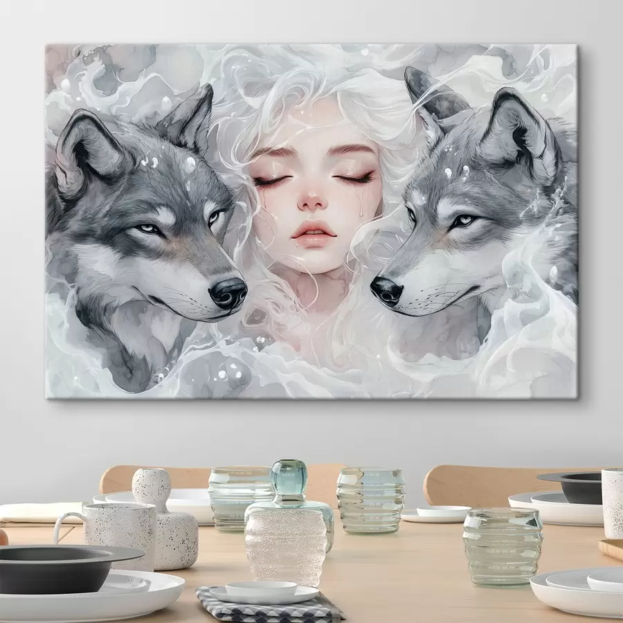 Graži mergaitė su pilkais vilkais, anime stilius, švelnios pastelinės spalvos