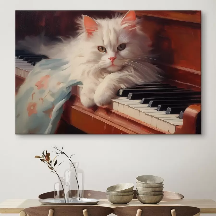 Balta katė guli ant fortepijono klavišų imitacijos tapyba