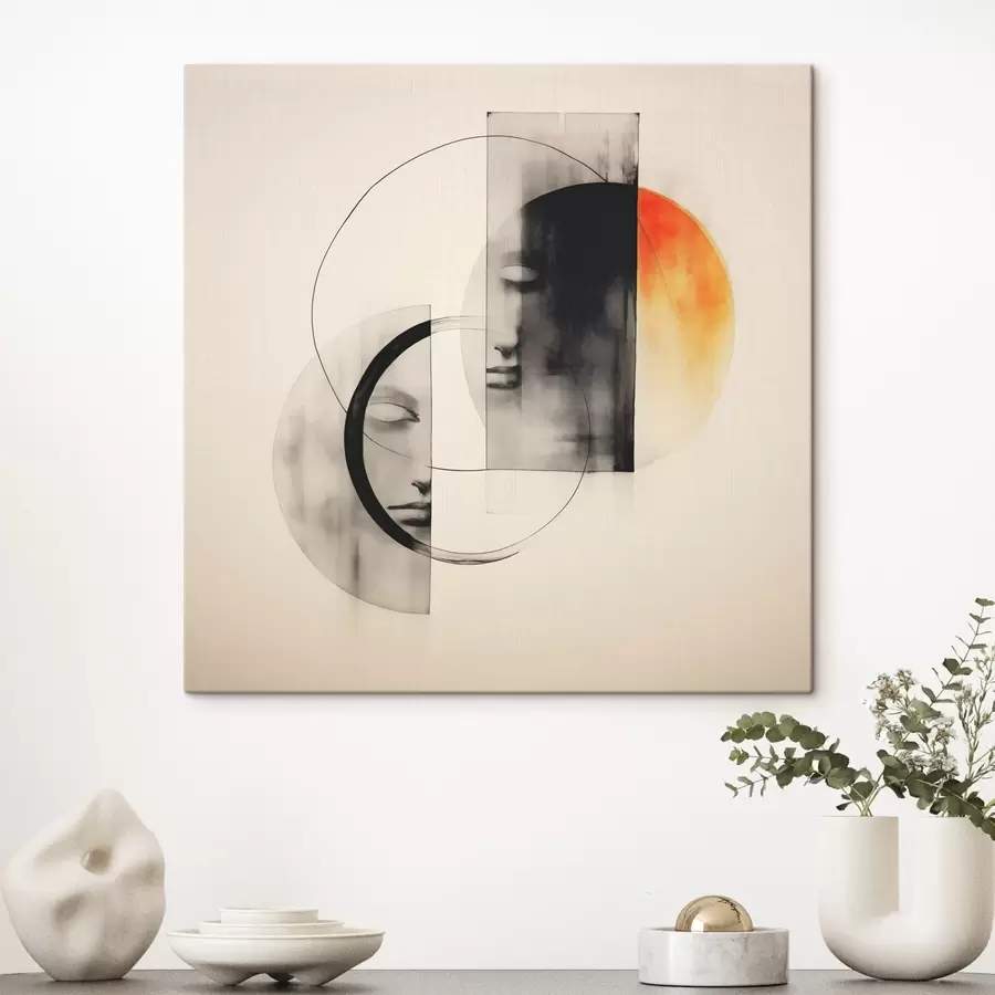 Geometrinė kompozicija su nusidėvėjimo efektu ir abstrakčiais veidais