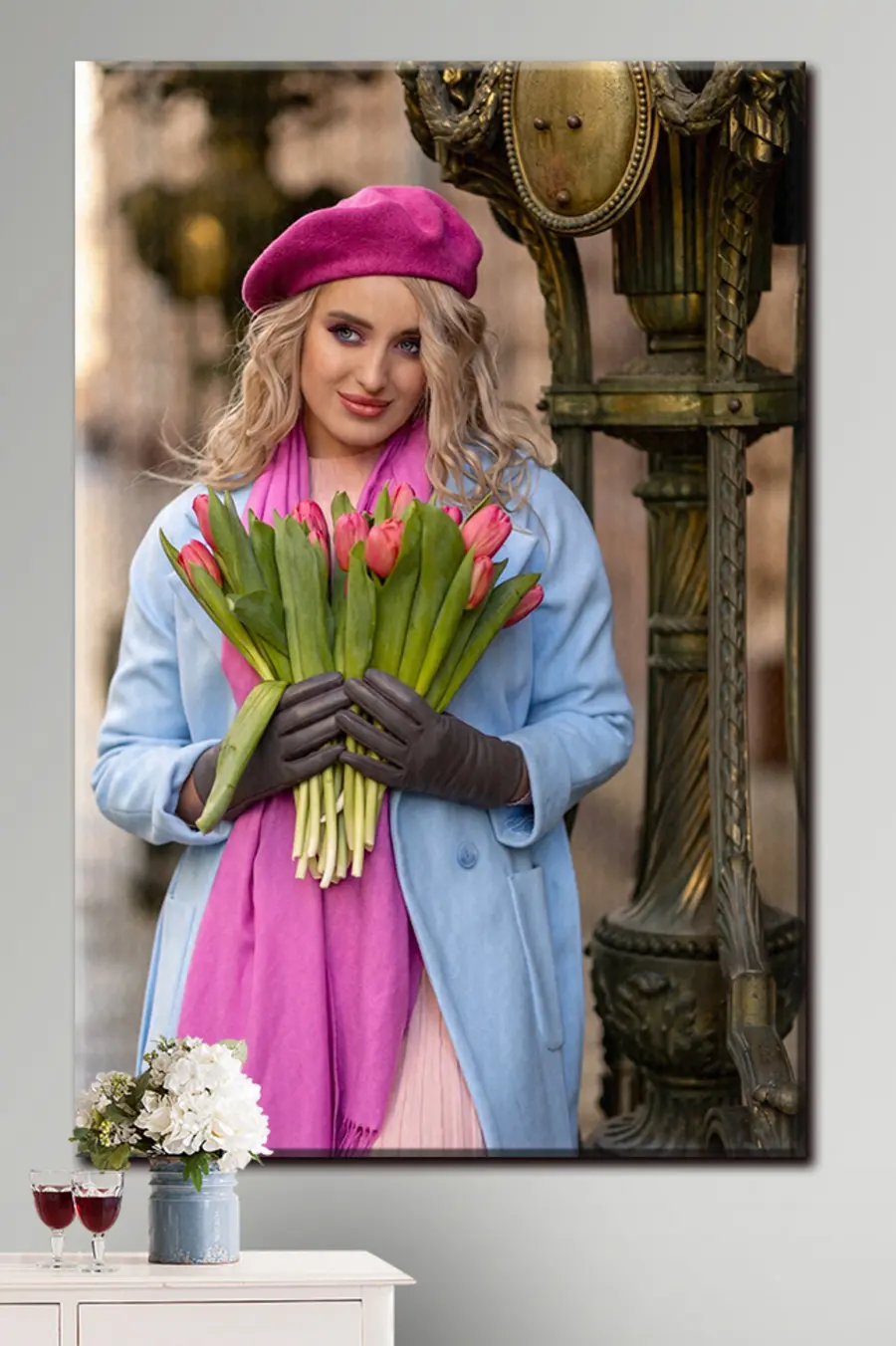 Viršutiniai drabužiai, šypsena ir violetinė spalva