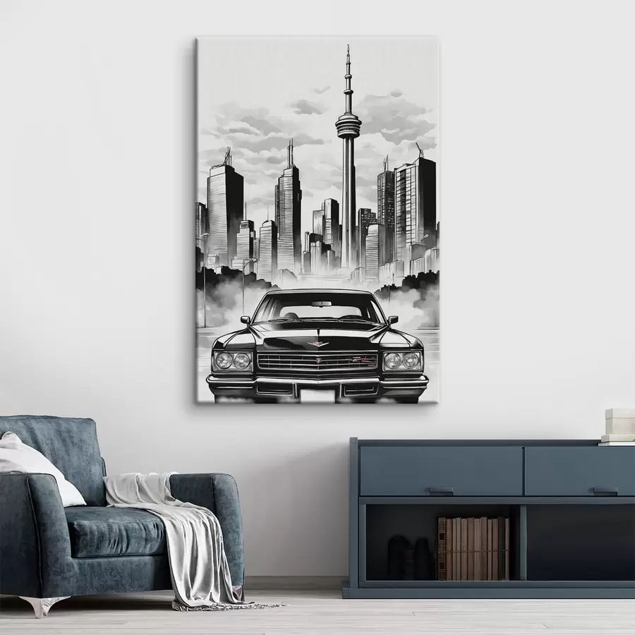 Retro automobilis nespalvoto miesto su dangoraižiais fone