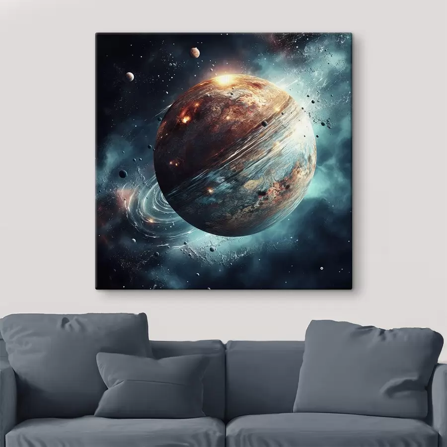 Kosminė iliustracija, planetos, mėlynas dangus, namas ant kalvos, medžiai