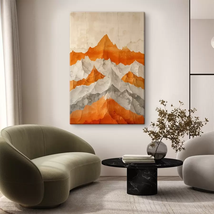 Abstrakčios oranžinės ir smėlio spalvos kalnų grandinės: trompe-l'oeil su skulptūrinėmis detalėmis