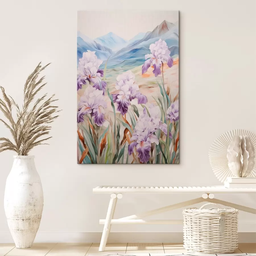 Lupinų gėlės, pieva, kalnai, akvarelės stilius, saulėlydžio dangus